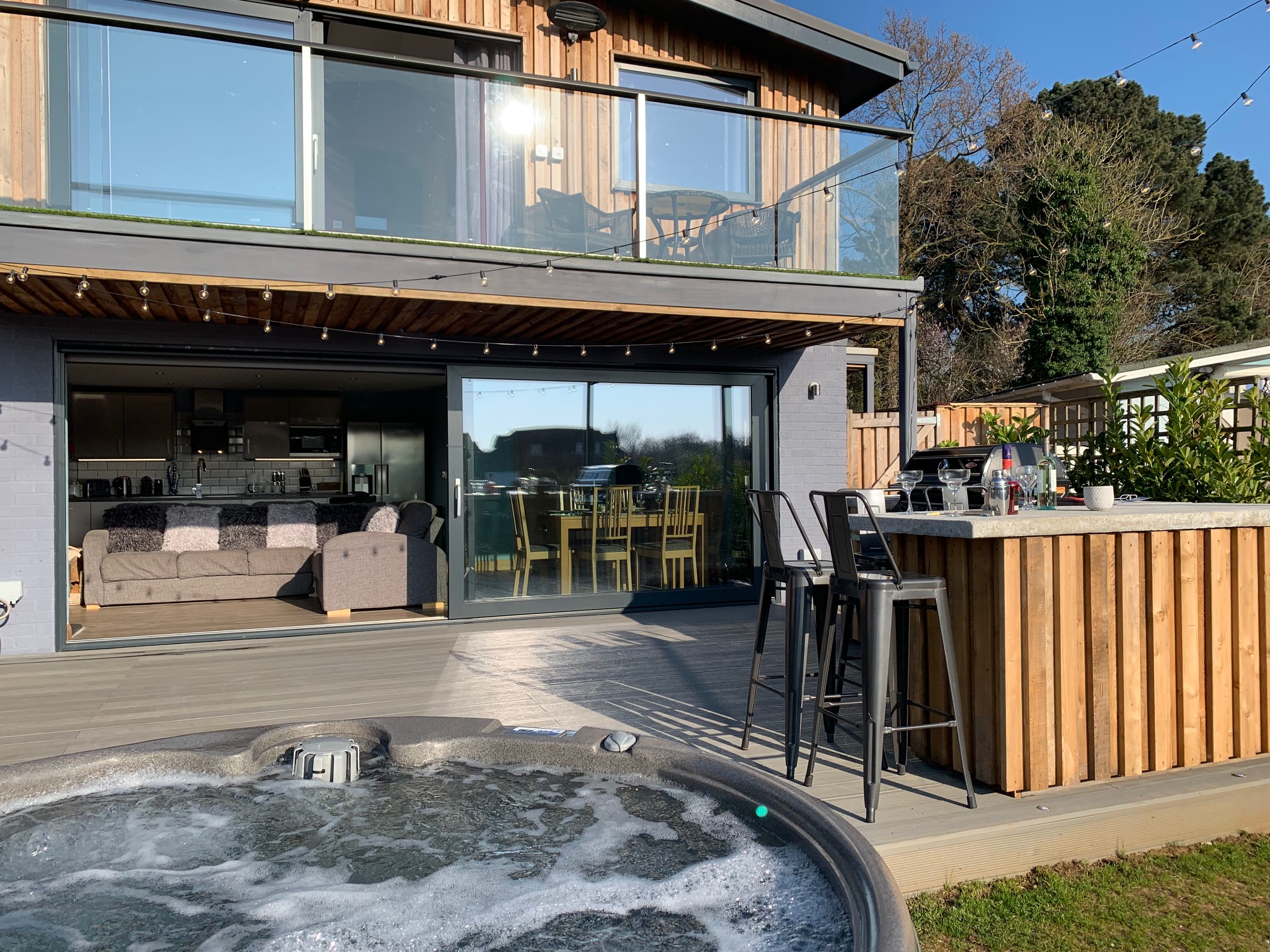- Outdoor kitchen with gas BBQ, outside sink and high top seating area